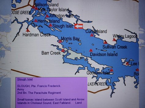 Slough Islet – Private Francis Frederick Slough. Army, 2nd Battalion The Parachute Regiment. Small tussac island between Scott Island and Arrow Islands in Choiseul Sound, East Falkland. Land.
