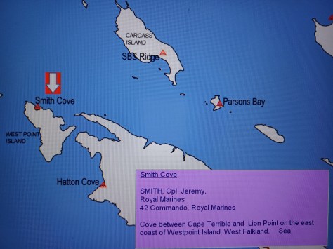 Smith Cove – Corporal Jeremy Smith. Royal Marines, 42 Commando, Royal Marines. Cove between Cape Terrible and Lion Point on the east coast of Westpoint Island, West Falkland. Sea.