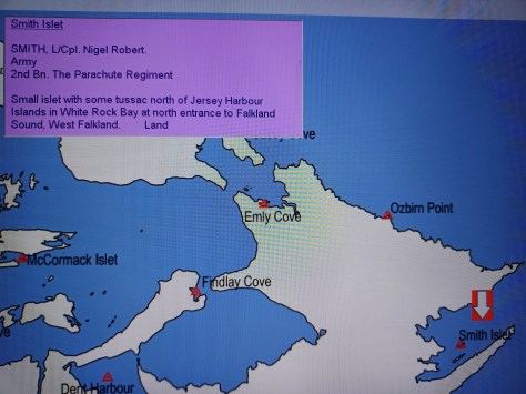 Smith Islet – Lance Corporal Nigel Robert Smith. Army, 2nd Battalion The Parachute Regiment. Small Islet with some tussac north of Jersey Harbour Islands in White Rock Bay at north entrance to Falkland Sound, West Falkland. Land.