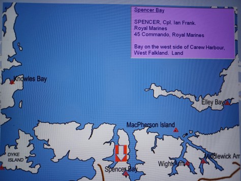 Spencer Bay – Corporal Ian Frank Spencer. Royal Marines, 45 Commando, Royal Marines. Bay on the west side of Carew Harbour, West Falkland. Land.