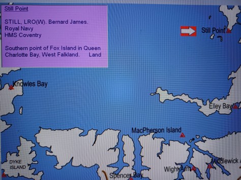 Still Point – LRO(W) Bernard James Still. Royal Navy, HMS Coventry. Southern point of Fox Island in Queen Charlotte Bay, West Falkland. Land.