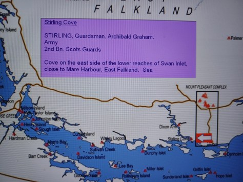 Stirling Cove – Guardsman Archibald Graham Stirling. Army, 2nd Battalion Scots Guards. Cove on the east side of the lower reaches of Swan Inlet, close to Mare Harbour, East Falkland. Sea.