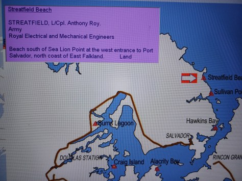 Streatfield Beach – Lance Corporal Anthony Roy Streatfield. Army, Royal Electrical and Mechanical Engineers. Beach south of Sea Lion Point at the west entrance to Port Salvador, north coast of East Falkland. Land.