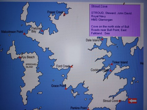 Stroud Cove – Steward John David Stroud. Royal Navy, HMS Glamorgan. Cove on the north side of Bull Roads near Bull Point, East Falkland. Sea.