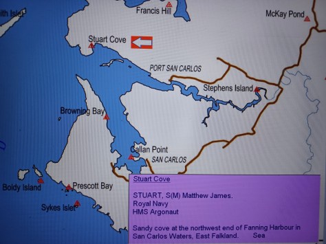 Stuart Cove – S(M) Matthew James Stuart. Royal Navy, HMS Argonaut. Sandy cove at the northwest end of Fanning Harbour in San Carlos Waters, East Falkland. Sea.