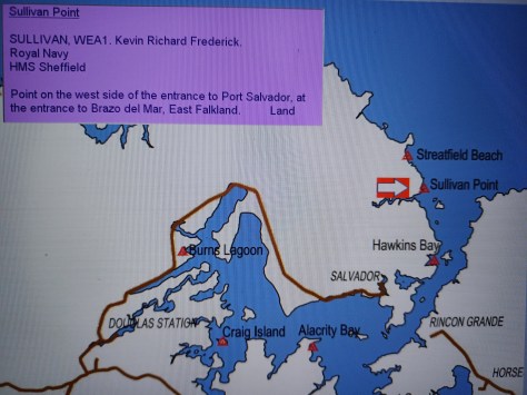 Sullivan Point – WEA1 Kevin Richard Frederick Sullivan. Royal Navy, HMS Sheffield. Point on the west side to Port Salvador, at the entrance to Brazo del Mar, East Falkland. Land.