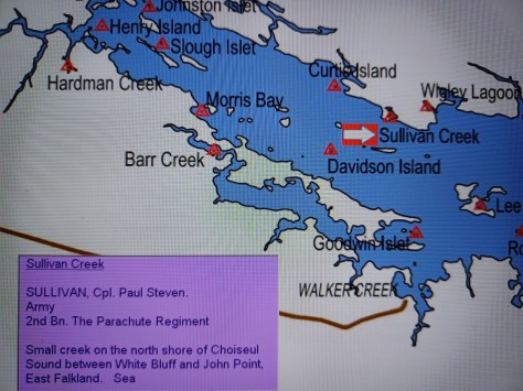 Sullivan Creek – Corporal Paul Steven Sullivan. Army, 2nd Battalion The Parachute Regiment. Small creek on the north shore of Choiseul Sound between White Bluff and John Point, East Falkland. Sea.