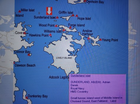 Sunderland Islet – AB/(EW) Adrian Derek Sunderland. Royal Navy, HMS Coventry. Small tussac island west of Middle Island in Choiseul Sound, East Falkland. Land.