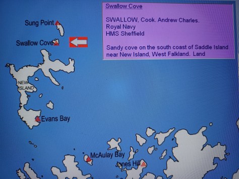Swallow Cove – Cook Andrew Charles Swallow. Royal Navy, HMS Sheffield. Sandy cove on the south coast of Saddle Island near New Island, West Falkland. Land.
