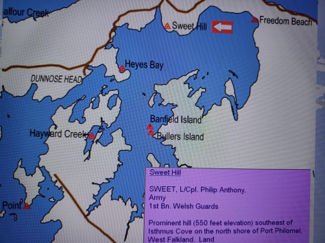 Sweet Hill – Lance Corporal Philip Anthony Sweet. Army, 1st Battalion Welsh Guards. Prominent hill (550 feet elevation) southeast of Isthmus Cove on the north shore of Port Philomel, West Falkland. Land.