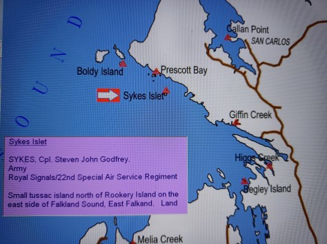 Sykes Islet – Corporal Steven John Godfrey Sykes. Army, Royal Signals and 22nd Special Air Service Regiment. Small tussac island north of Rookery Island on the east side of Falkland Sound, East Falkland. Land.
