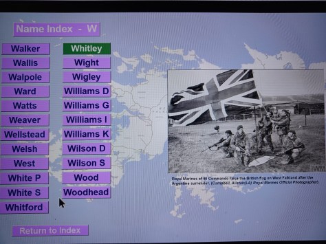 Names Index – W – (Photo Credit Alistair (LA) Campbell – Royal Marine Official Photographer.) Royal Marines of 40 Commando raise the British Flag on West Falkland after the Argentine surrender.