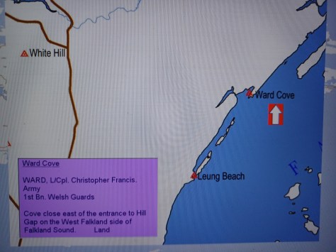 Ward Cove – Lance Corporal Christopher Francis Ward. Army, 1st Battalion Welsh Guards. Cove close east of the entrance to Hill Gap on the West Falkland side of Falkland Sound. Land.