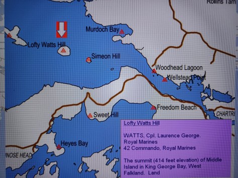 Lofty Watts Hill – Corporal Laurence George Watts. Royal Marines, 42 Commando, Royal Marines. The summit (414 feet elevation) of Middle Island in King George Bay, West Falkland. Land.