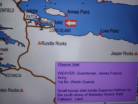 Weaver Islet – Guardsman James Francis Weaver. Army, 1st Battalion Welsh Guards. Small tussac islet inside Duperrey Harbour on the south shire of Berkeley Sound, East Falkland. Land.