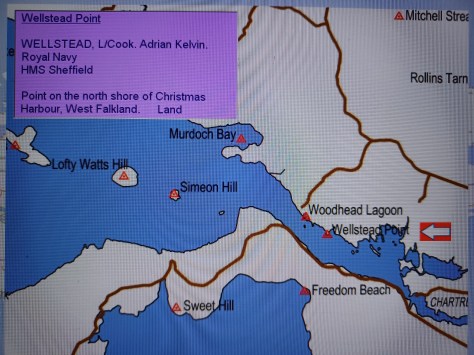 Wellstead Point – L/Cook Adrian Kelvin Wellstead. Royal Navy, HMS Sheffield. Point on the north shore of Christmas Harbour, West Falkland. Land.