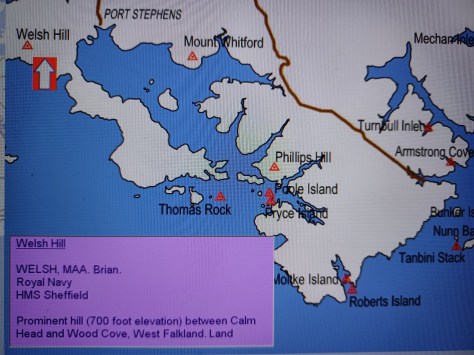 Welsh Hill – MAA Brian Welsh. Royal Navy, HMS Sheffield. Prominent Hill (700 foot elevation) between Calm Head and Wood Cove, West Falkland. Land.
