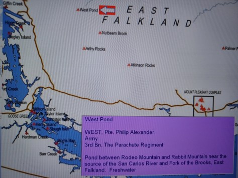 West Pond – Private Philip Alexander West. Army, 3rd Battalion The Parachute Regiment. Pond between Rodeo Mountain and Rabbit Mountain near the source of the San Carlos River and Fork of the Brooks, East Falkland. Freshwater.