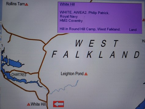 White Hill – AWEA2 Philip Patrick White. Royal Navy, HMS Coventry. Hill in Round Hill Camp, West Falkland. Land.