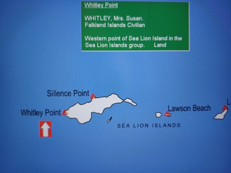 Whitley Point – Mrs Susan Whitley, Falkland Islands Civilian. Western Point of Sea Lion Island in the Sea Lion Island group. Land.