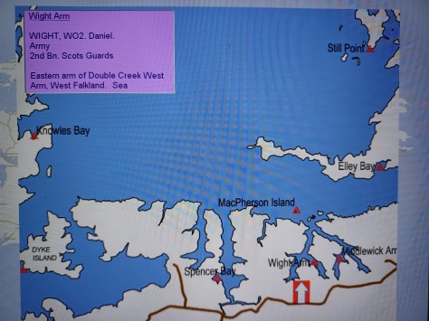 Wight Arm – Warrant Officer 2 Daniel Wight. Army, 2nd Battalion Scots Guards. Eastern Arm of Double Creek West Arm, West Falkland. Sea.