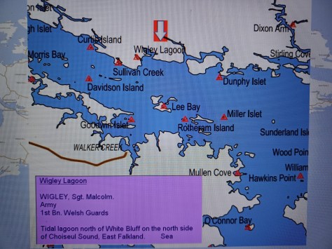 Wigley Lagoon – Sergeant Malcolm Wigley. Army, 1st Battalion Welsh Guards. Tidal lagoon north of White Bluff on the north side of Choiseul Sound, East Falkland. Sea.