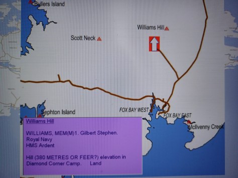 Williams Hill – MEM(M)1 Gilbert Stephen Williams. Royal Navy, HMS Ardent. Hill (380 metres or feet? elevation) in Diamond Corner Camp. Land.