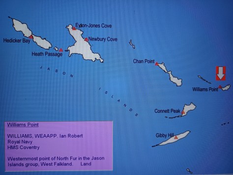 Williams Point – WEAAPP Ian Robert Williams. Royal Navy, HMS Coventry. Westernmost point of North Fur in the Jason Islands group, West Falkland. Land.