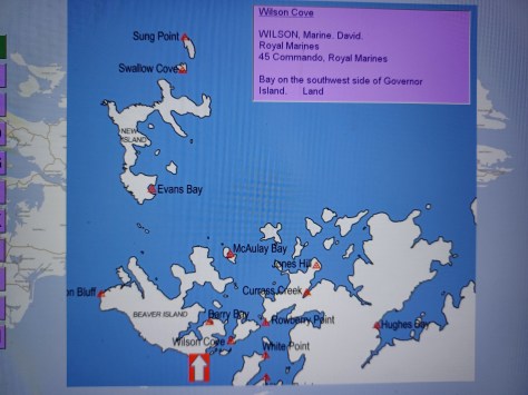 Wilson Cove – Marine David Wilson. Royal Marines, 45 Commando, Royal Marines. Bay on the southwest side of Governor Island. Land.