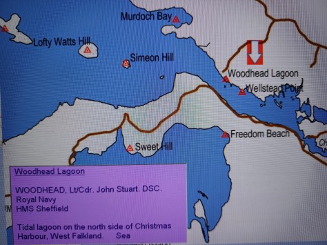 Woodhead Lagoon – Lieutenant Commander John Stuart Woodhead DSC. Royal Navy, HMS Sheffield. Tidal Lagoon on the north side of Christmas Harbour, West Falkland. Sea.