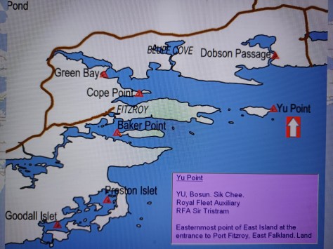 Yu Point – Bosun Sik Chee Yu. Royal Fleet Auxiliary. RFA Sir Tristram. Easternmost point of East Island at the entrance to Port Fitzroy, East Falkland. Land.