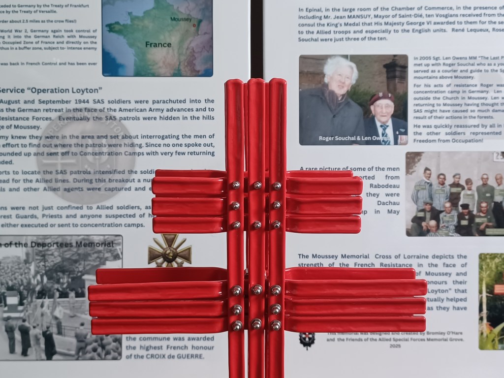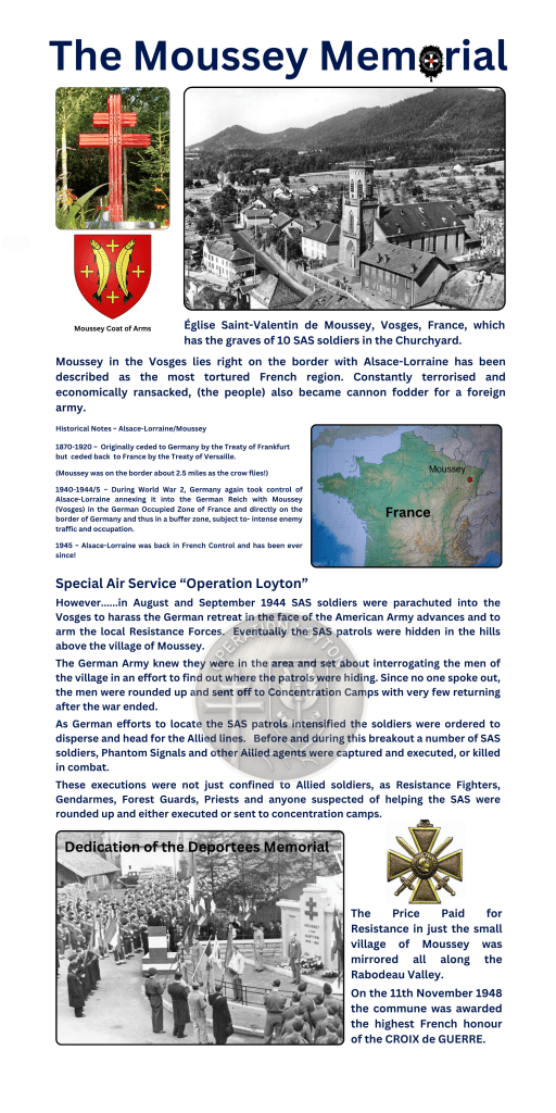 The Moussey Memorial honours the Citizens of Moussey in the Vosges for their covert help and assistance to the members of the 2nd Special Air Service Regiment who served during WW2 on “Operation Loyton” in August & September 1944.