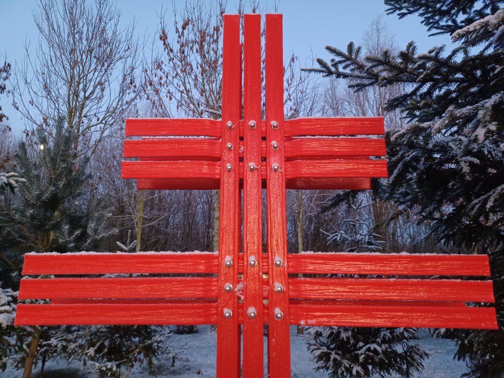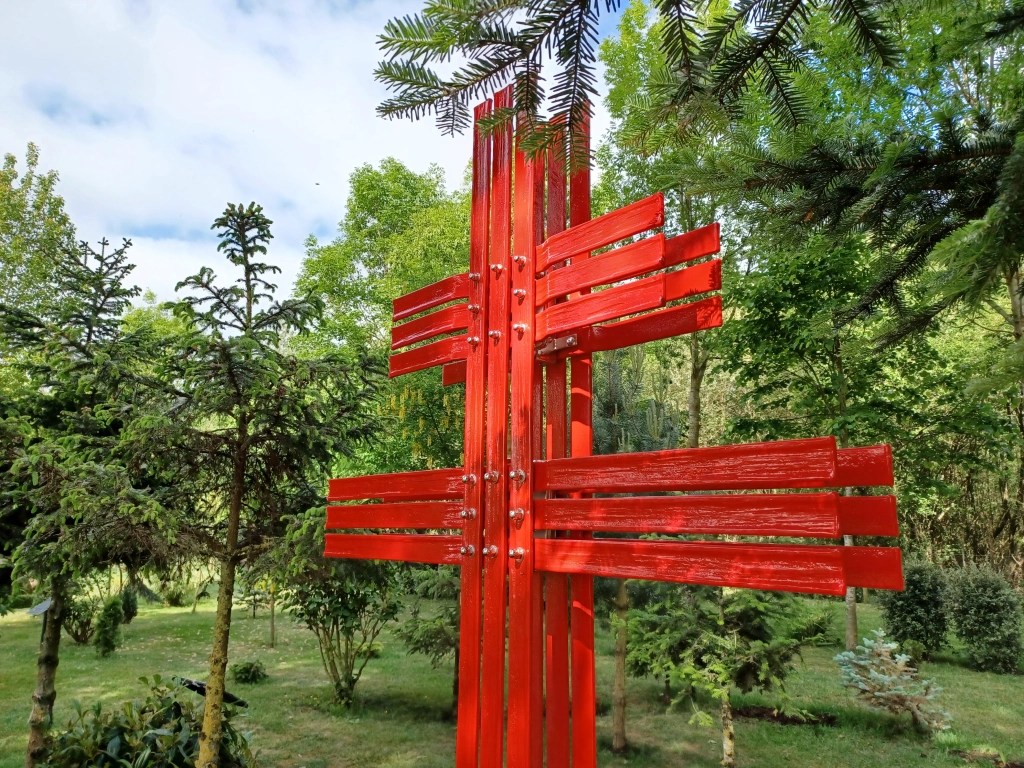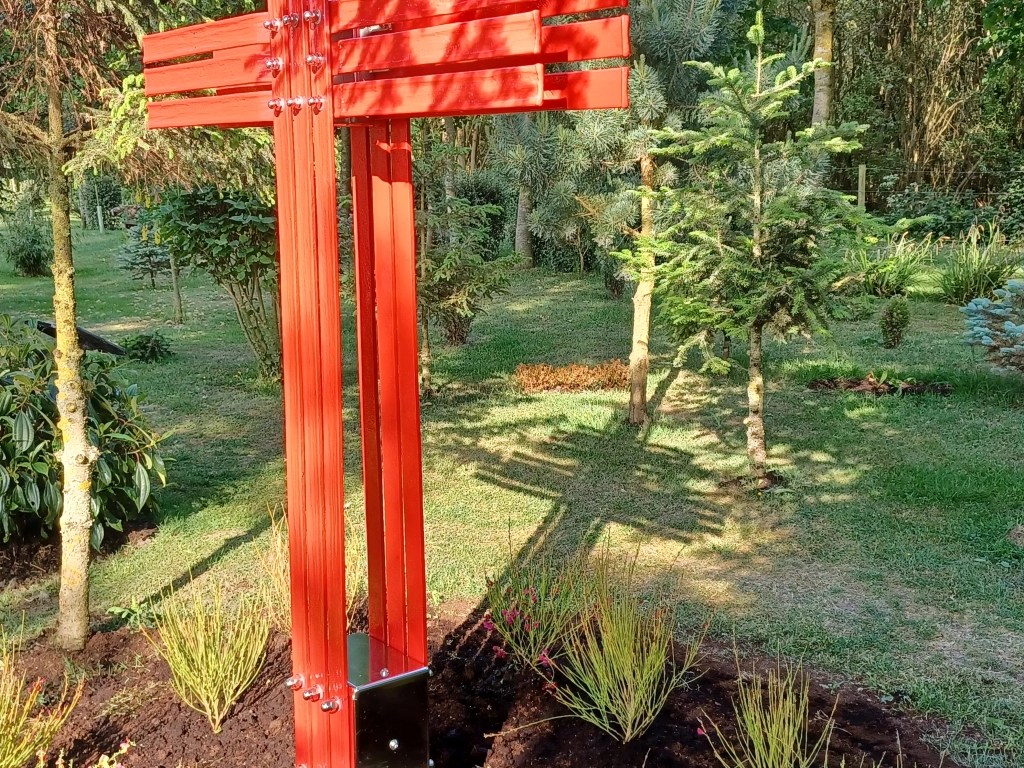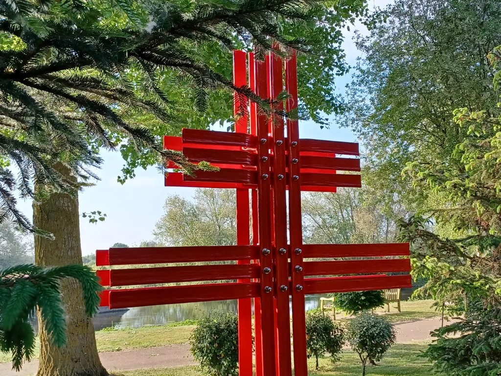 The Cross of Lorraine was the symbol of Resistance in France during the Second World War. This Cross was created by Bromley O’Hare – Blacksmith/Artisan and is made of mild steel, galvanized and powder coated with industrial paint called “Traffic Light Red”. The stainless fittings have all been pickled and polished prior to fitting.