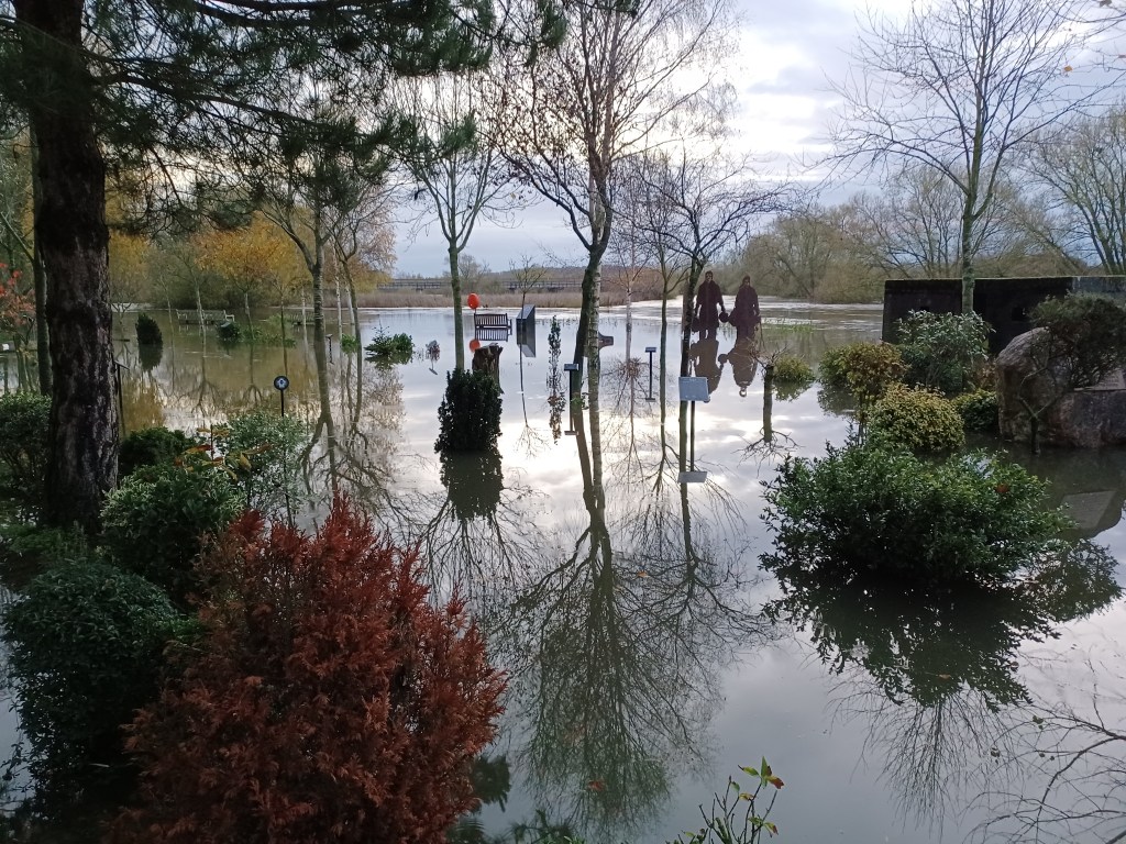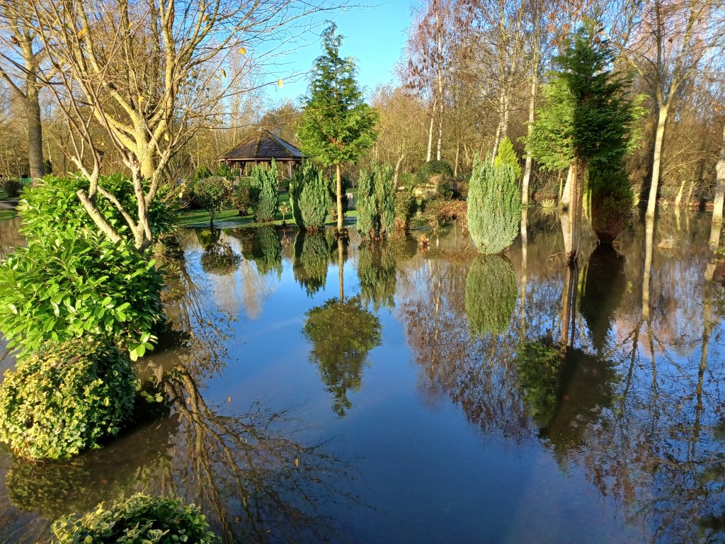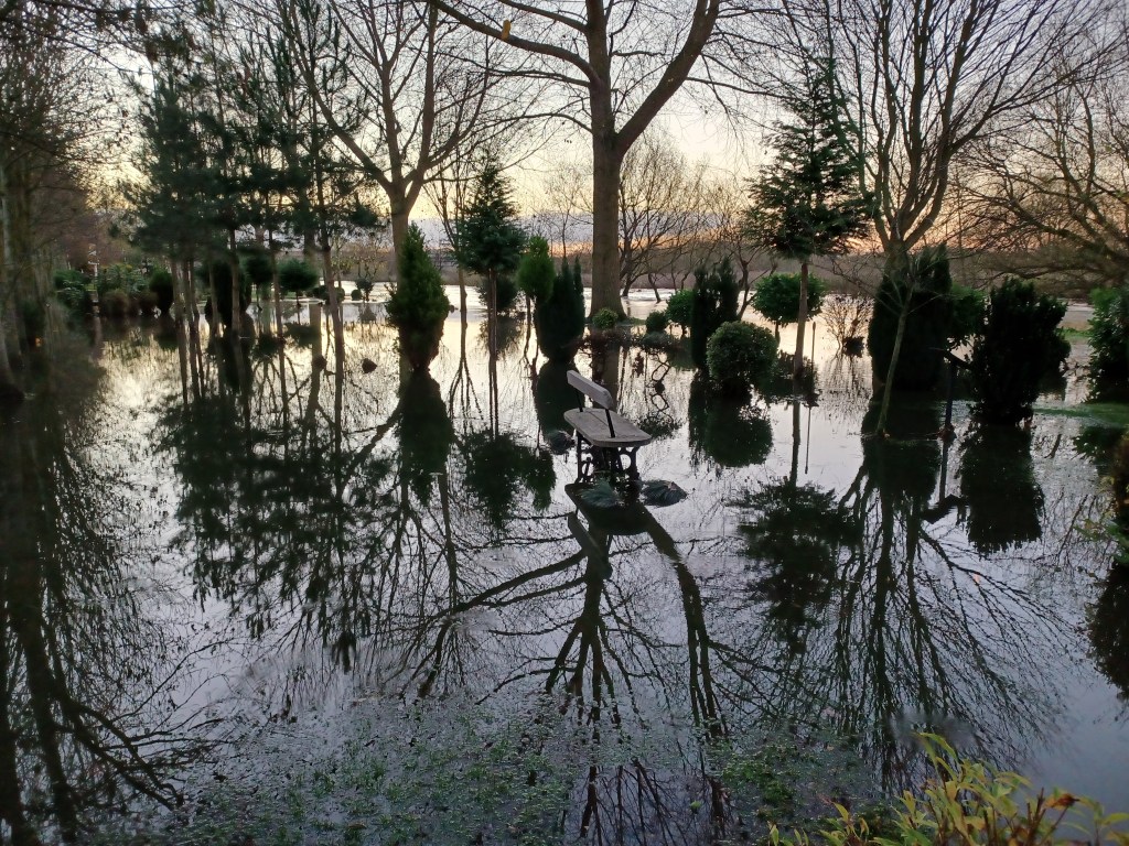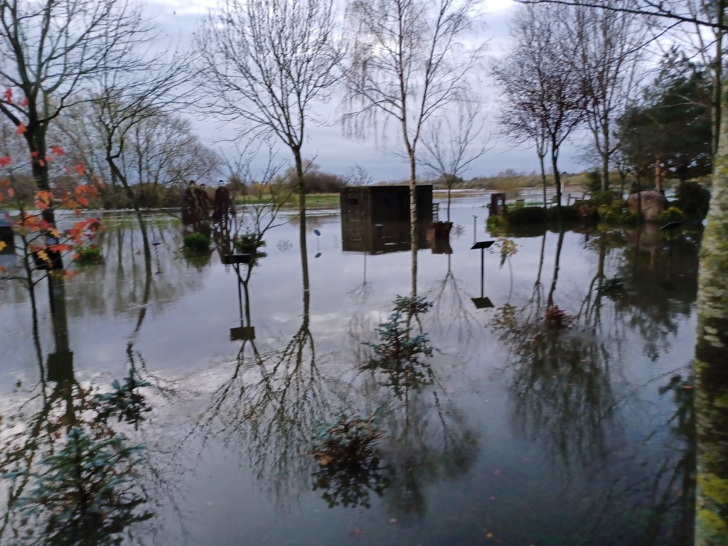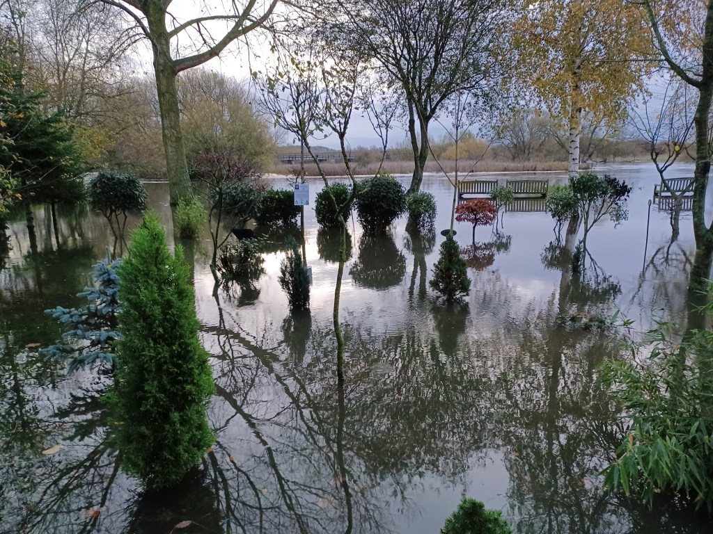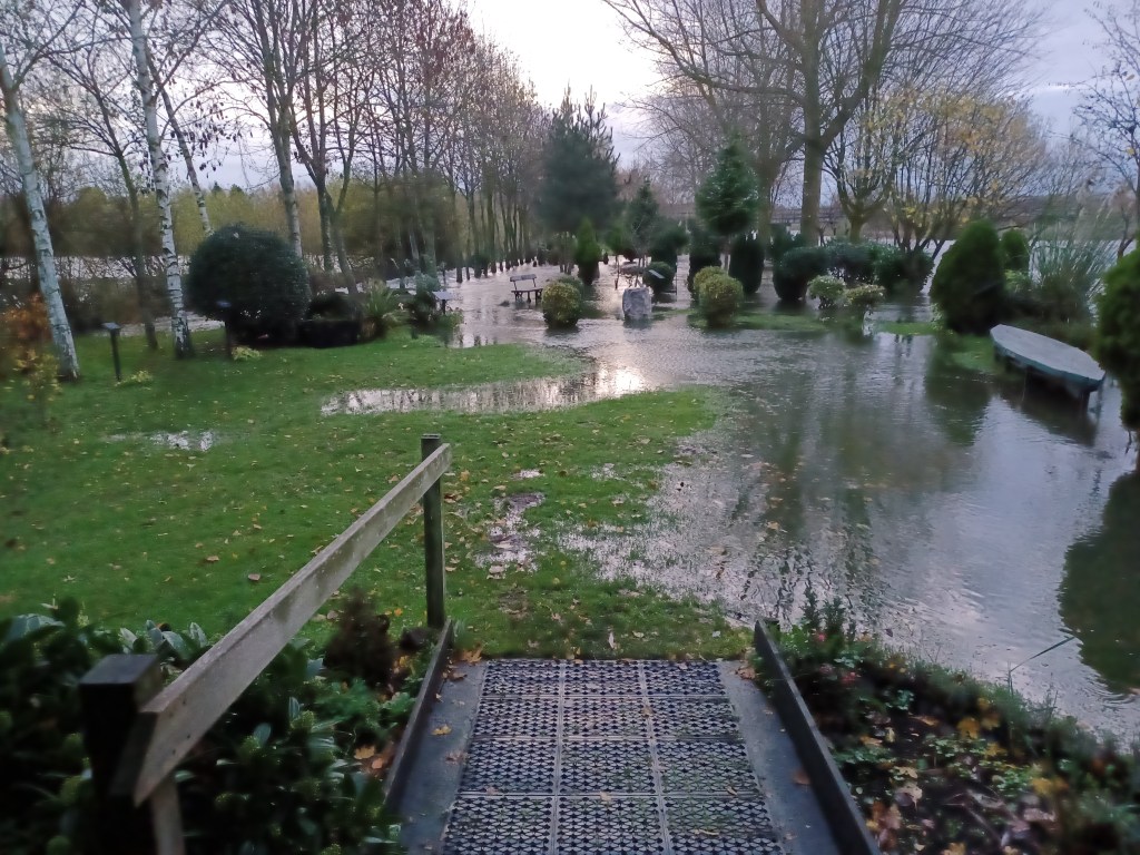 Overnight rain has swelled the River Tame and as we are situated right in the middle of a flood plain between the Tame and the Trent , the Grove is underwater again for the second time this year. Last year we had 9 floods!