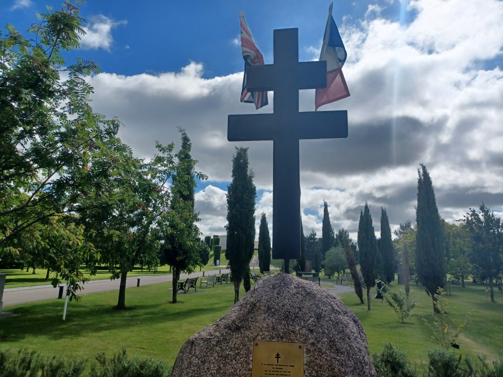 3. The Coral Granite with the commemorative plaque set in, and the Cross of Lorraine with the French and British Flags.