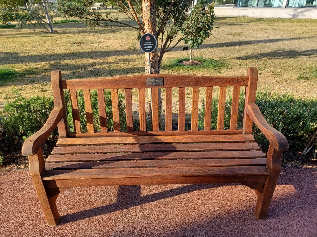 9. Memorial Plaques commemorating Len and his late wife Tess on seat in garden.