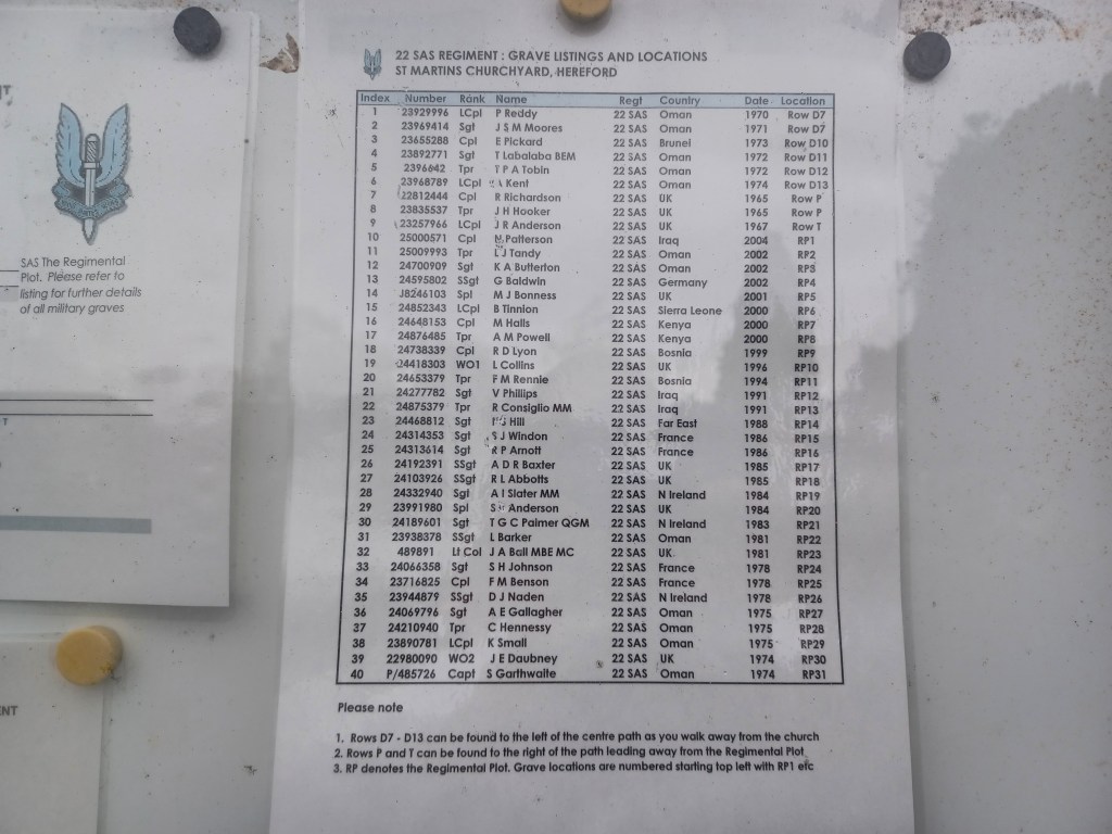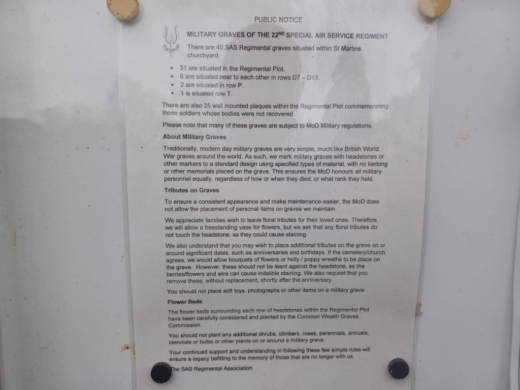 St. Martins was the first chosen cemetery for SAS Soldiers in Hereford and on my visit at the start of February 2026 I am pleased to find that all the Graves both inside the main plot and those in further reaches of the Graveyard are well maintained. So a great deal of thanks must go to the regular maintenance team attending to them.