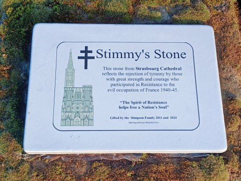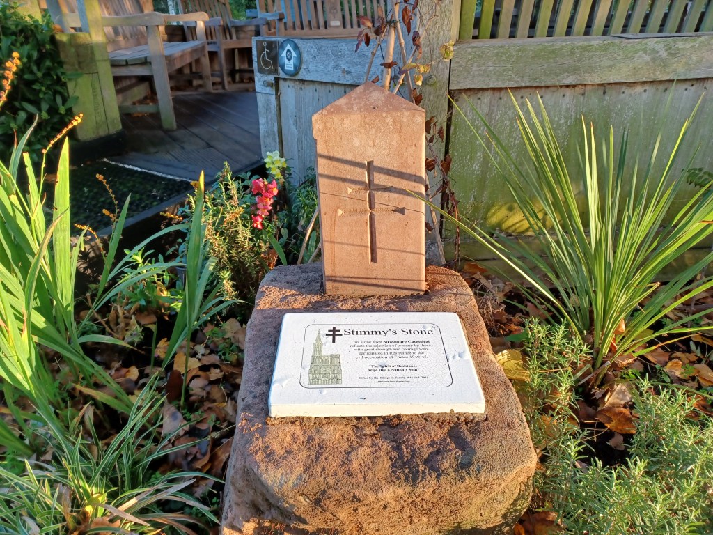 - “Stimmy’s Stone” or more like Stimmy’s three stones join together a piece of Old Red Sandstone from Consall Hall; a piece of stone from Strasbourg Cathedral is suitably carved with the Cross of Lorraine and the latest stone plaque made from Lava Stone and created by the artist Sonia Rinaldi.